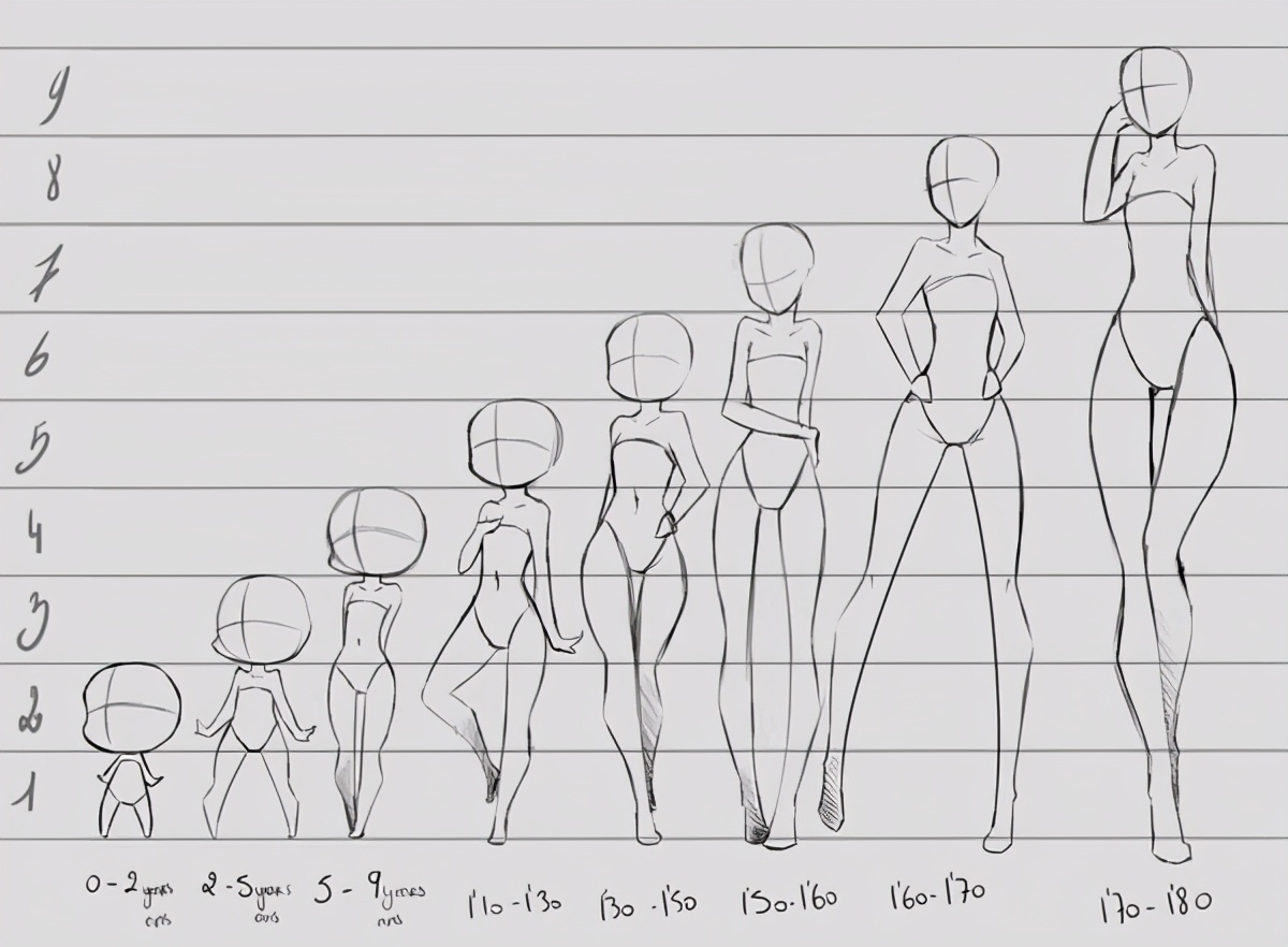 这张图,主要画了人物的比例,一般我们画画的时候以一个头为尺标。从5头身开始往上是写实(5头身是人类婴儿的比例,6-7是青少年到正常成年人的比例,9头身现实很少或者说没有!!),往下是算Q版现实里面是不存在的。再从风格来看:最左边,是2头身看上去非常可爱;最右边的是9头身,就是我们常说的模特身高,修长有魅力。我们可以看到,不同的头身,有着不同的风格。