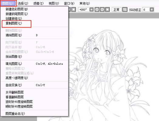 打开一个线稿的话,刚开始有些线稿是比较淡的,几乎都看不太清楚怎么办呢?那我们可以看一下下面的图片就知道了,这个时候可以执行【图层——复制图层】这一步需要多少次就看你效果了~