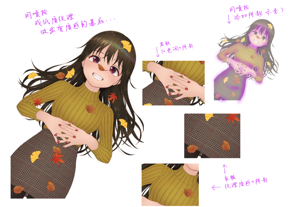 用闭喷枪添加阴影,皮肤红色调加阴影,衣服纹理质感加阴影