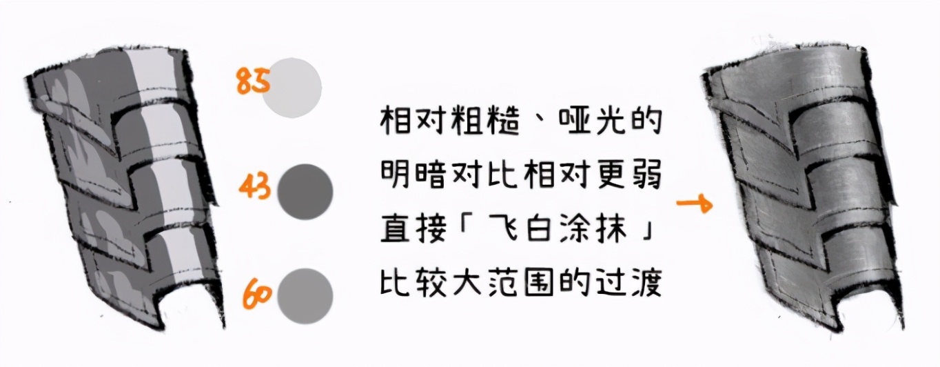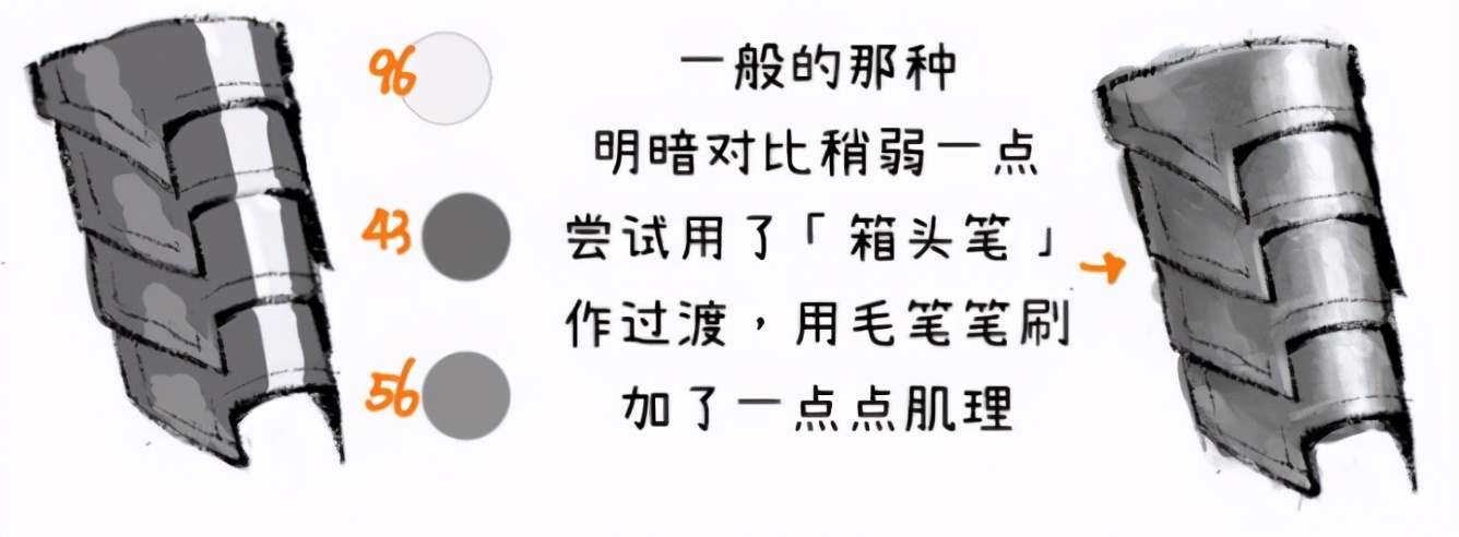 另外像金属盔甲这种上面可能还会有划痕之类的瑕疵,视情况加上更能体现材质,这里不多说了,以上就是对金属材质素描关系上的一些思考总结,加上色彩的话材质的表现会更加丰富。