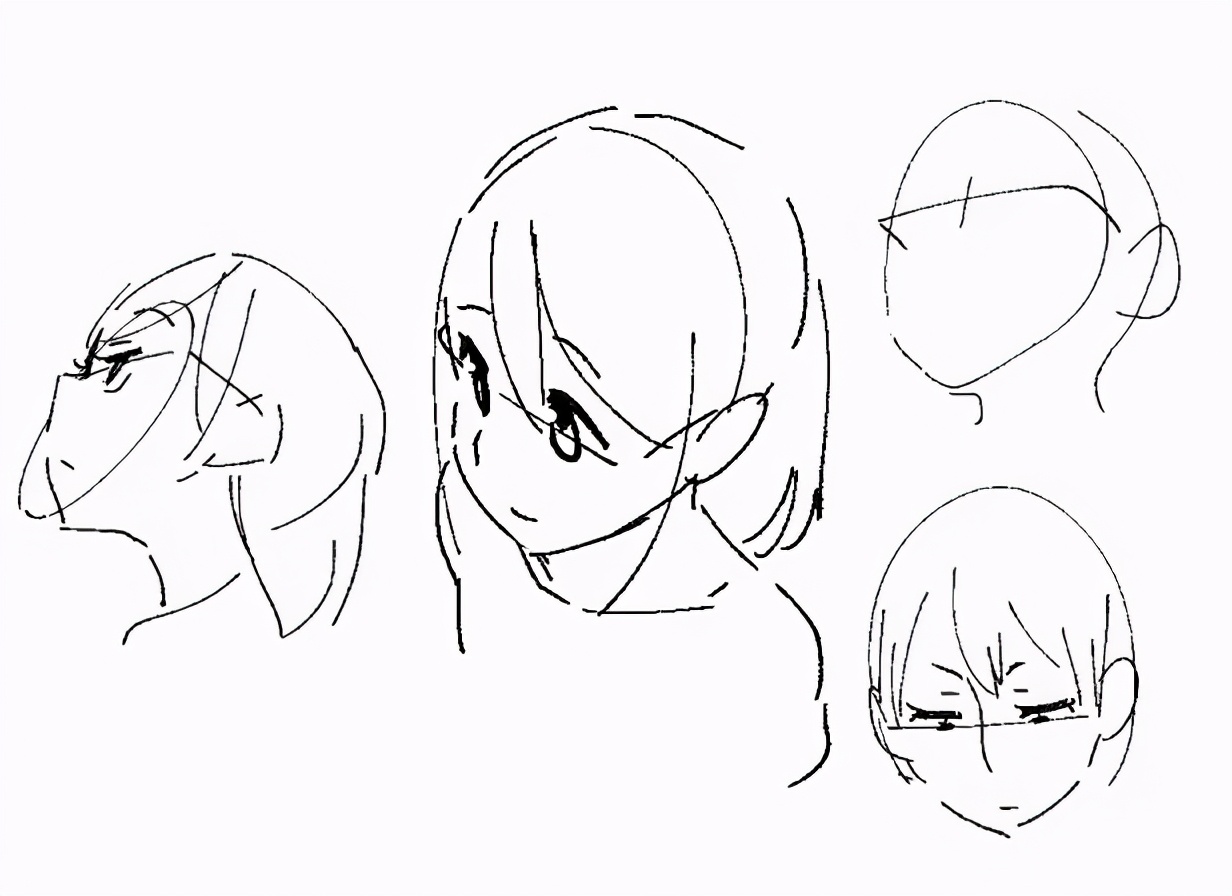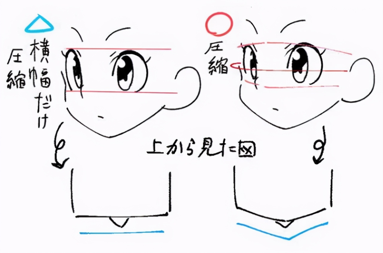在斜向角度中,将眼睛的内侧进行上下左右压缩的感觉进行作画是一个比较好的方法。这个时候如果上下的长度还保持一样的话会产生一定的违和感。是一种经常被说左边是一个平面的画法