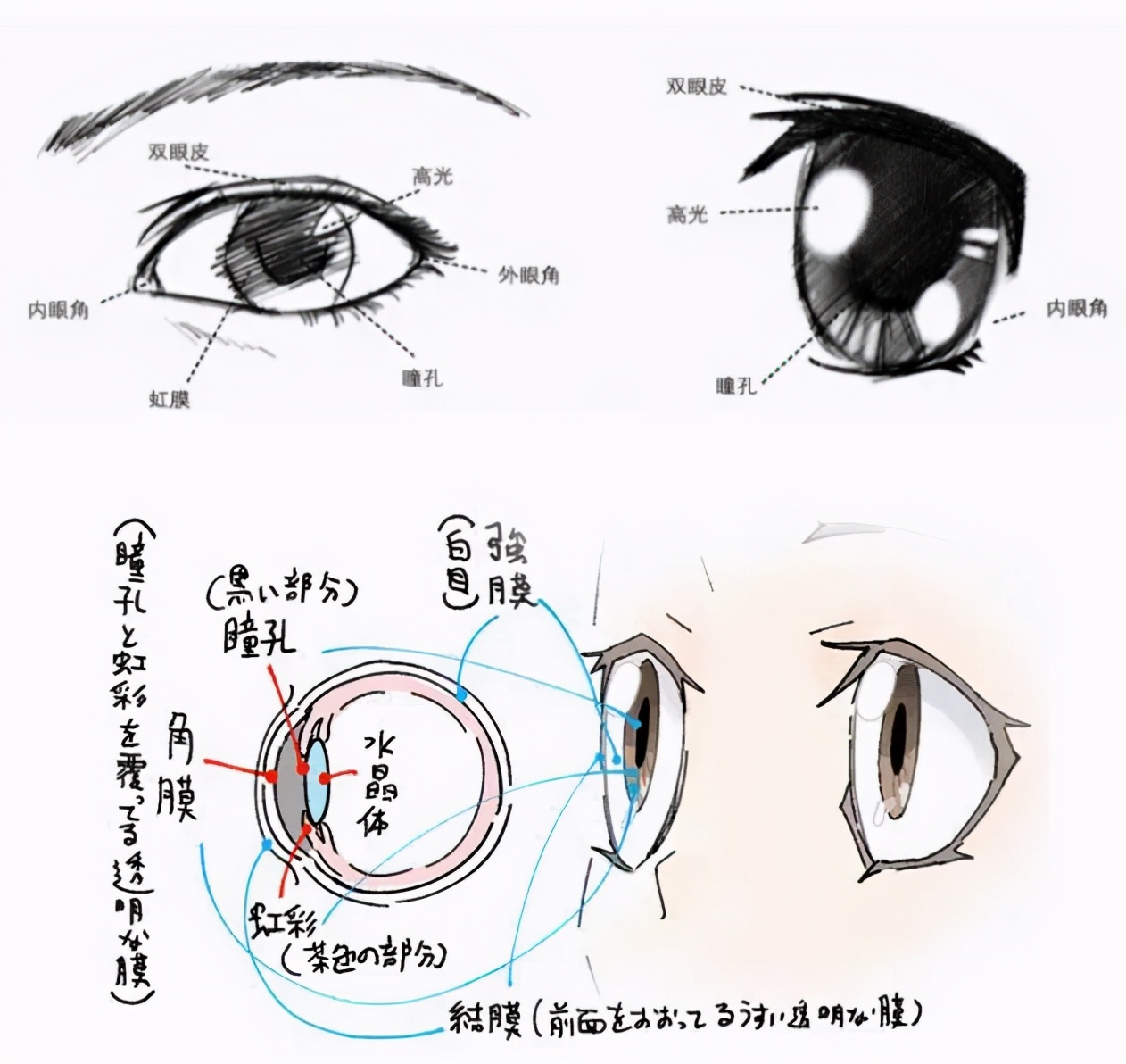 写实的眼睛的结构较为复杂,二次元的眼睛会对结构进行简化,下面我们继续往下看。