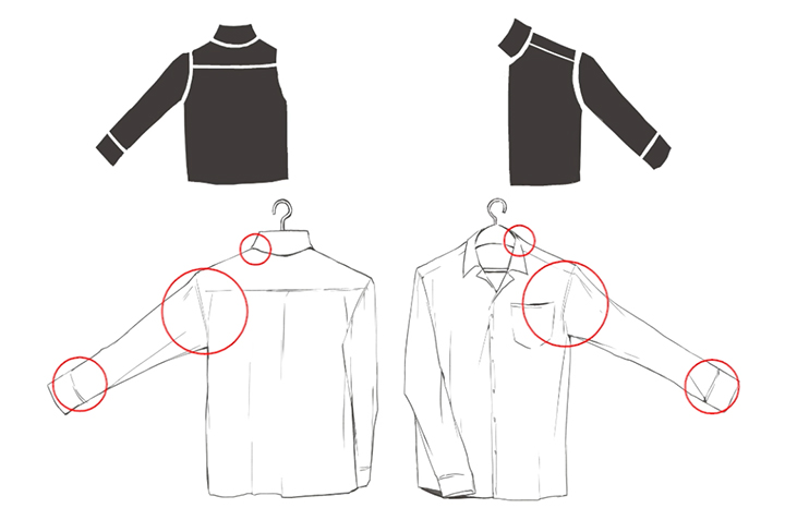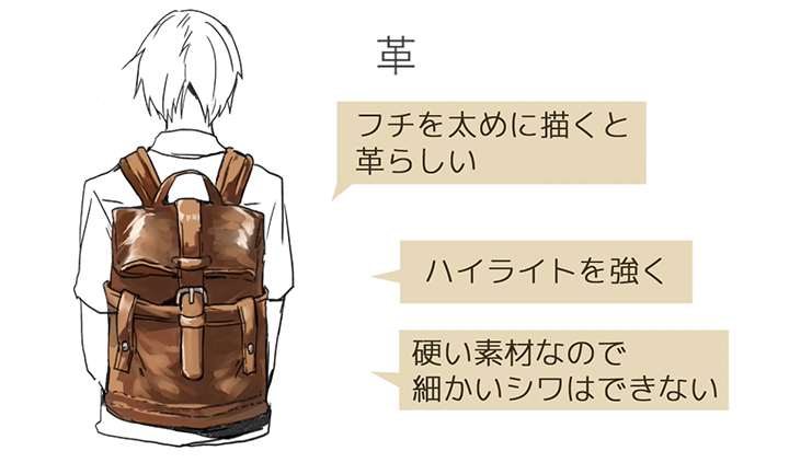 在注意硬度和材质等的同时,用接缝部分和皱纹本身的对比度、皱纹的形式来表现布料的质感。