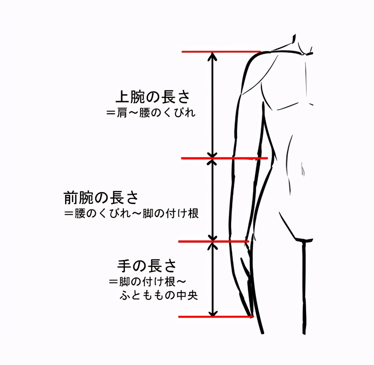 因为肩部的长度影响,前臂一般稍微会比上臂长一点,这点在画的时候需要大家注意。