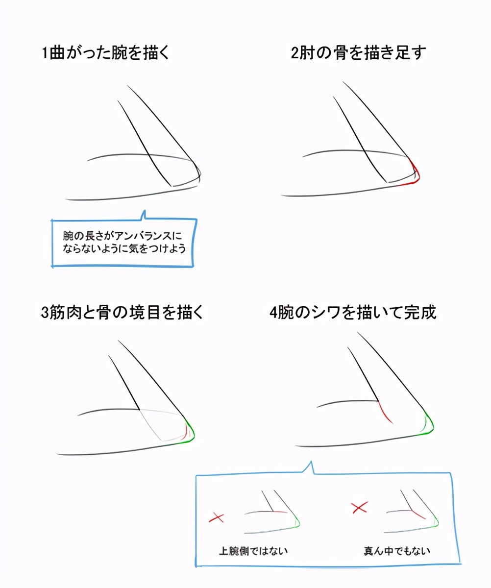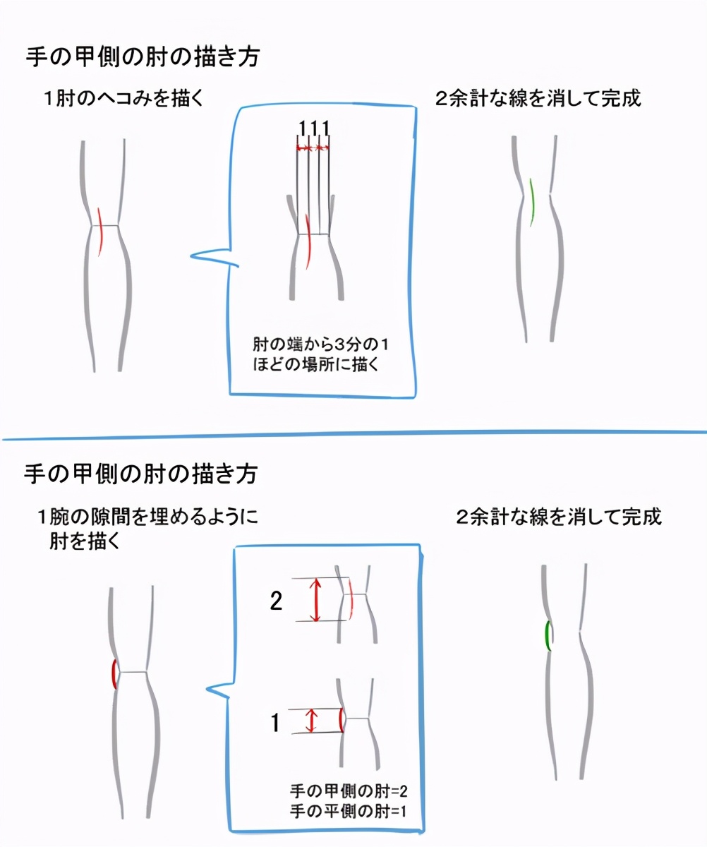 手肘是一个比较复杂的位置,从正面、侧面、背面上的结构都是不同的,画起来也不能一样。