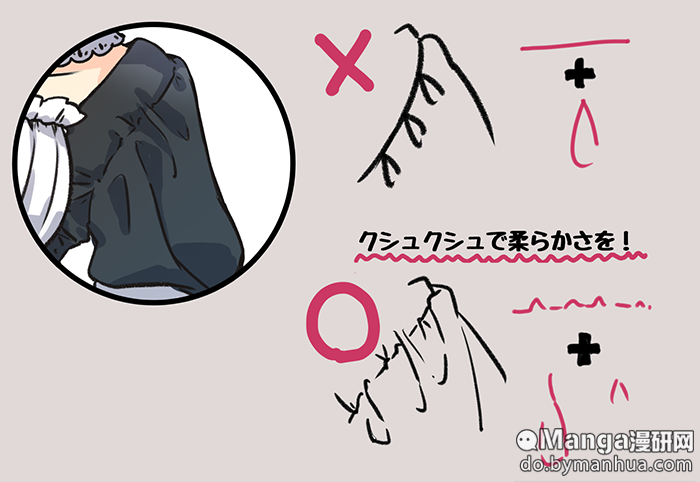 因此,非常推荐使用这种“在褶皱波浪变化不是很大布里再加入褶皱线条”的画法。这样看起来很均衡,能让插图看起来很好些。