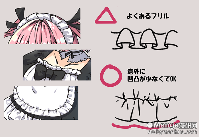 调查一下褶边画法的话,图中上面例子的“褶边画法”有过很详细的教程。但是,以这样立体的形状画出所有褶边的话,较小处的褶边就会给人乱七八糟的感觉。