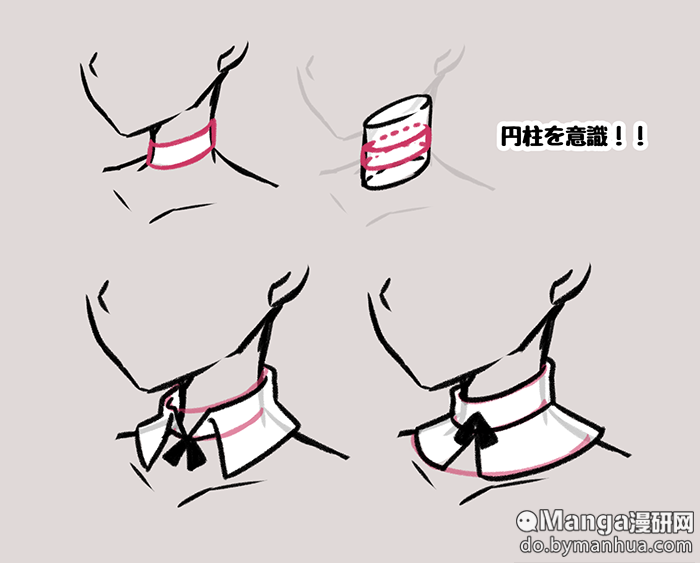衣领类型的也是一样,画完脖子后再从圆柱的中间处折下来。