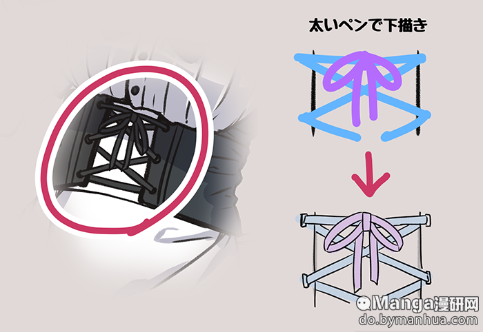 接下来,这是在女仆服和洛丽塔服的紧身胸衣设计中经常能看到的“系带”的绘画方法。根据体型来调节系带,这样做能让服装线条更合身。