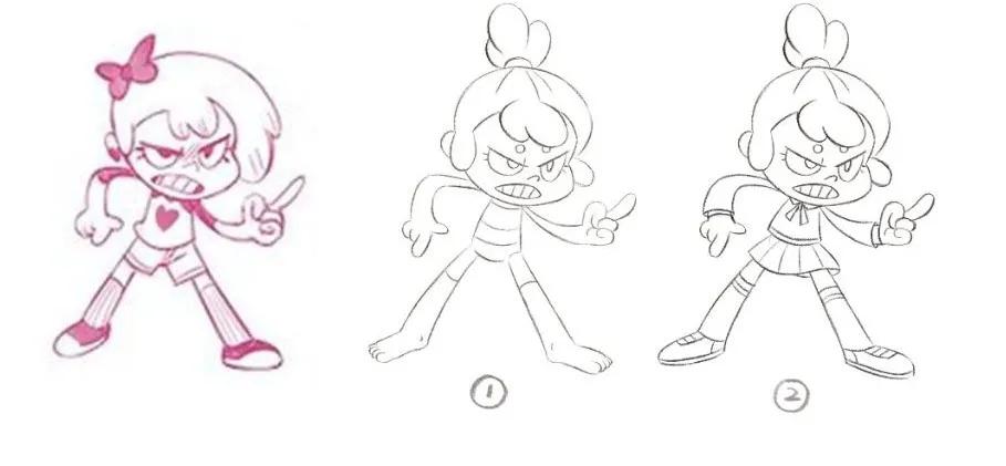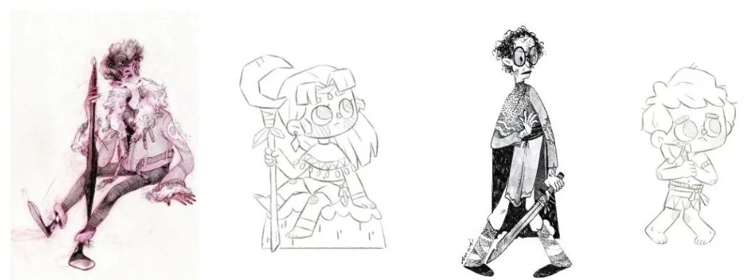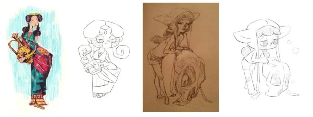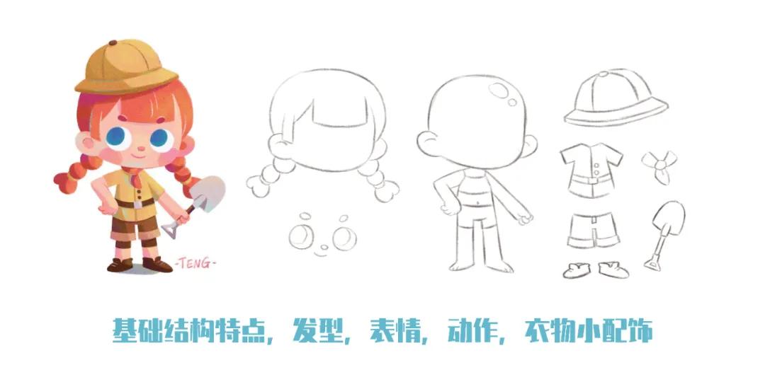 比如,将以上人物进行结构拆解:发型,动作,衣物的小配饰等等,把完整的角色拆分成各个细小的关键点,建立逐一突破的思考练习体系,考虑其各个细节的特点;