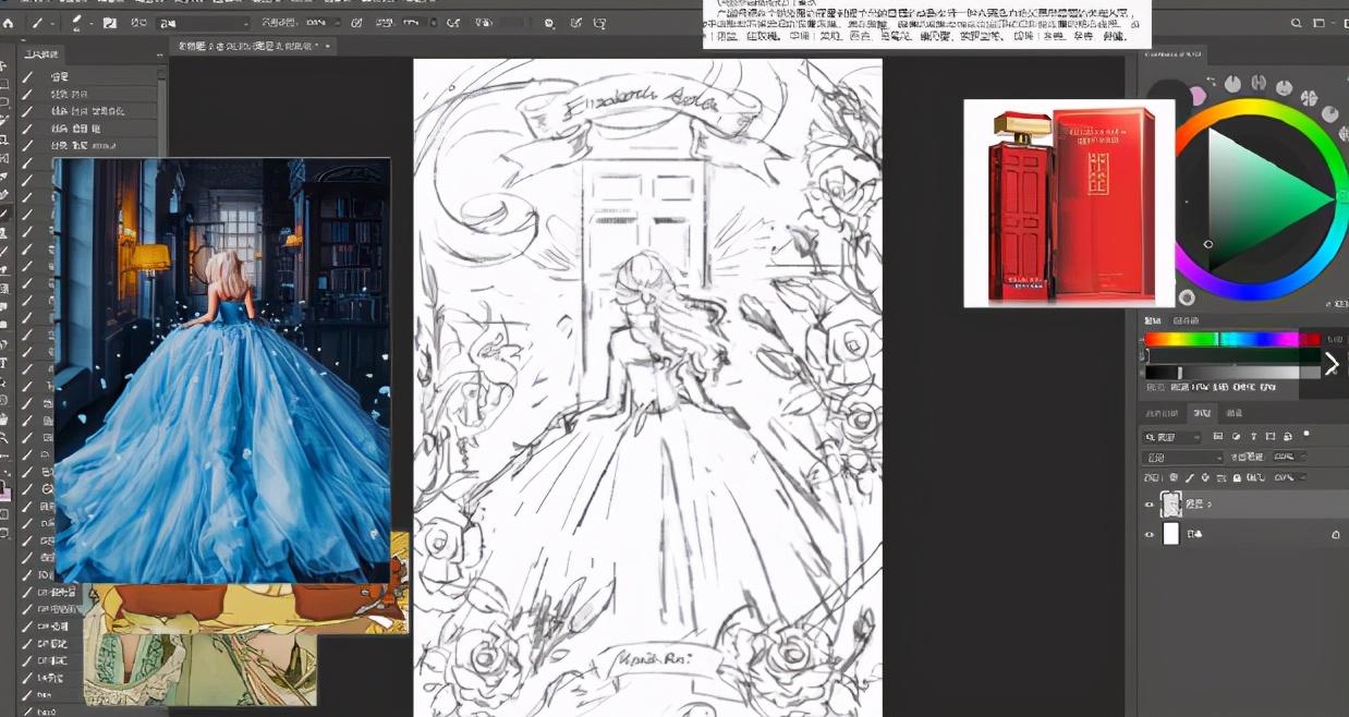 结合主要商品收集素材,将能用上的素材都融入到构图中,绘制草稿。