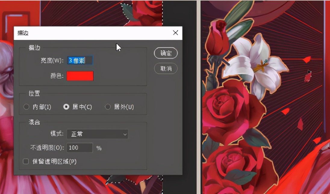 给花花合图层,按住ctrl+缩略图载入选区,选择选区工具,右键选择描边。