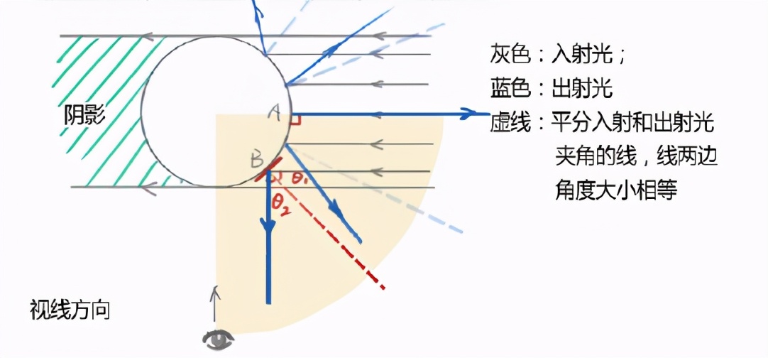 所以圆桶上的高光不在A点(受光最直接的地方),因为那边的光垂直入射,然后直接反射回去了,不进入你的眼睛,反而暗。这条线上方部分的光根本不会反射进你的眼睛(就是你看到的物体背后的东西),不需要去考虑。反射进入你眼睛里最多的点反而是B点,因为反射光直射了你的眼睛。我们平时最需要考虑明暗的其实是黄色部分(由光源方向决定,不是由你视线决定),这部分光线反射会进入你的眼睛。