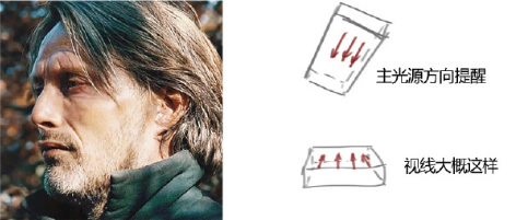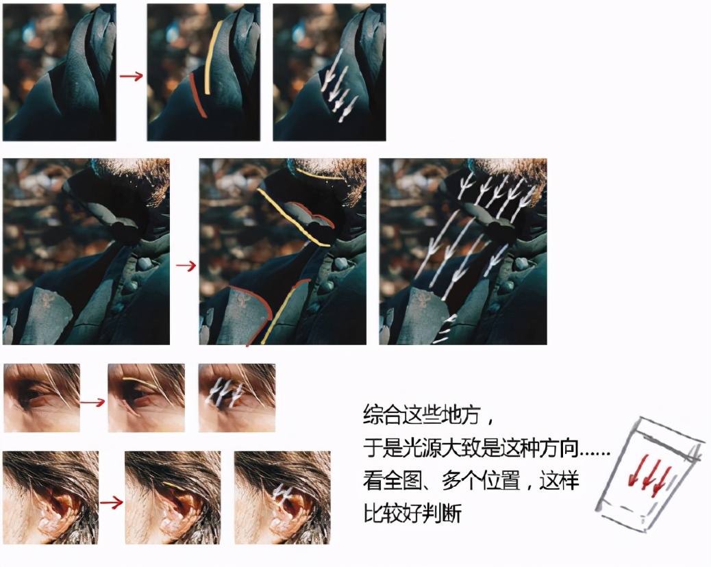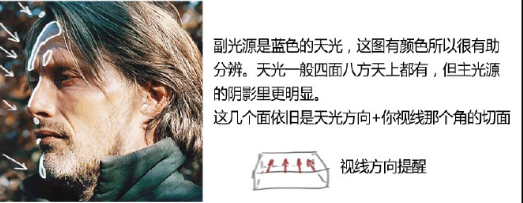 看一张照片时,先找一找哪里的投影边缘是硬的不是柔的,然后看看哪个物件会造成这样的投影。两者连线就是光源的方向。可以拿手比划一下。