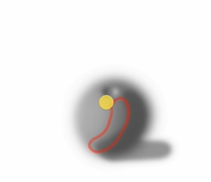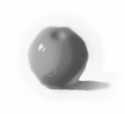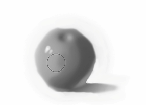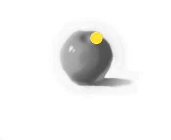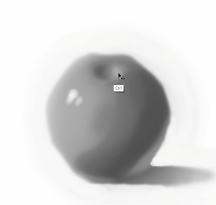 第四步,缩小笔刷,选较深的灰色在苹果顶端画一笔,用白色覆盖一笔,把苹果窝塑造出来,