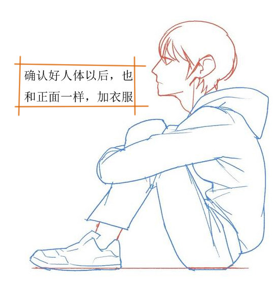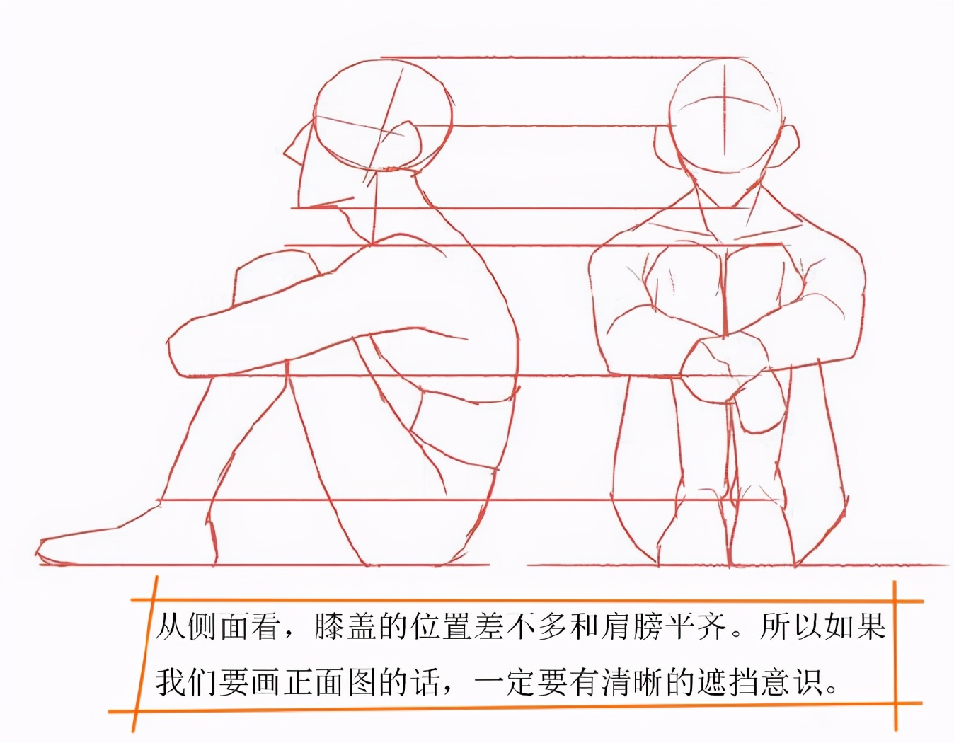 从侧面看,膝盖的位置差不多和肩膀平齐。所以如果我们要画正面图的话,一定要有清晰的遮挡意识。