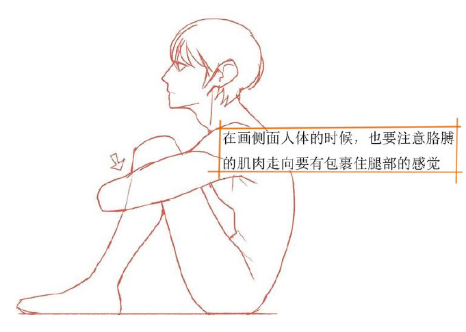 在画侧面人体的时候,也要注意胳膊的肌肉走向要有包裹住腿部的感觉