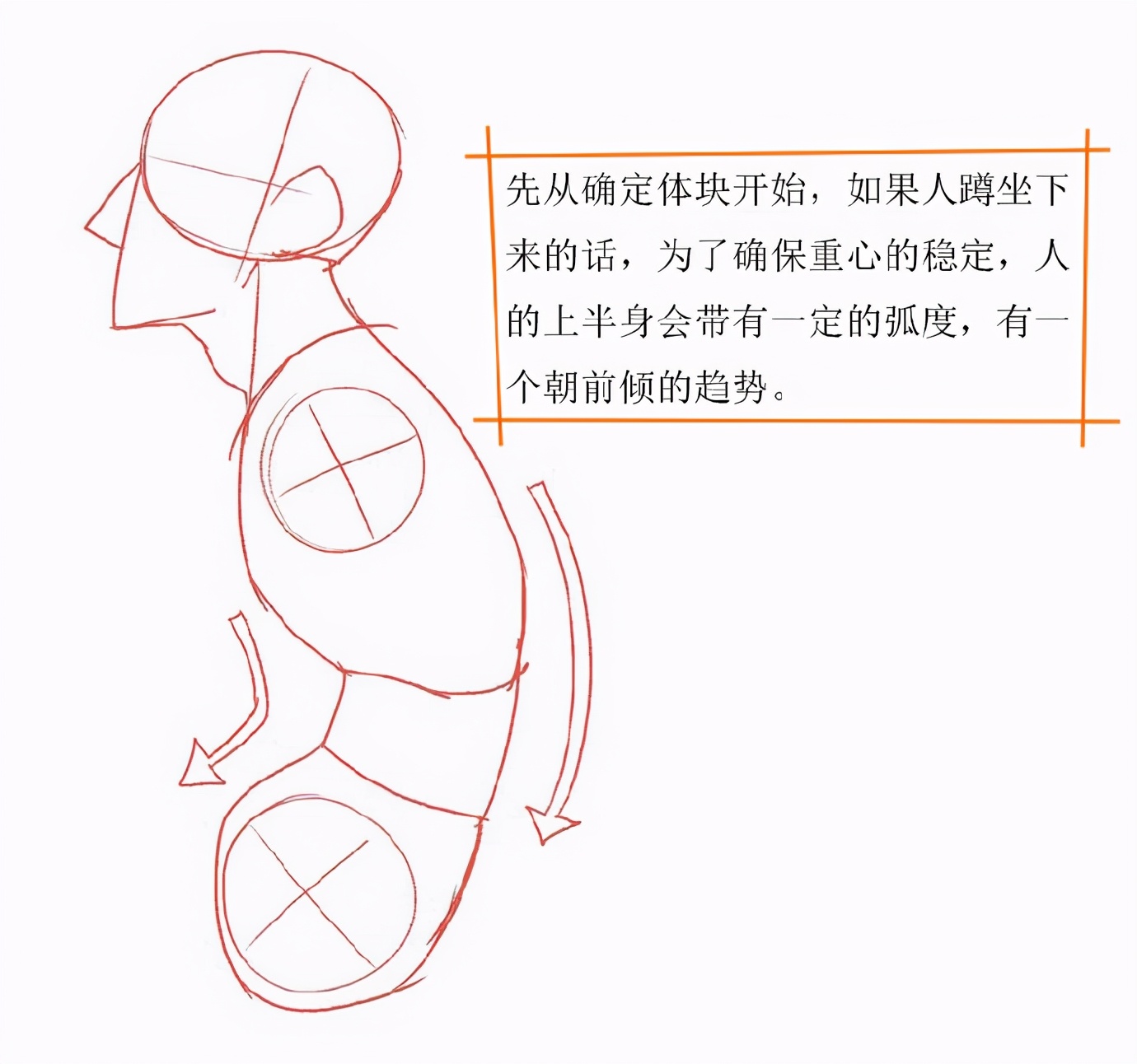 先从确定体块开始,如果人蹲坐下来的话,为了确保重心的稳定,人的上半身会带有一定的弧度,有一个朝前倾的趋势。