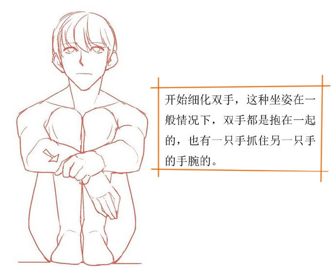 开始细化双手,这种坐姿在一般情况下,双手都是抱在一起的,也有一只手抓住另一只手的手腕的。