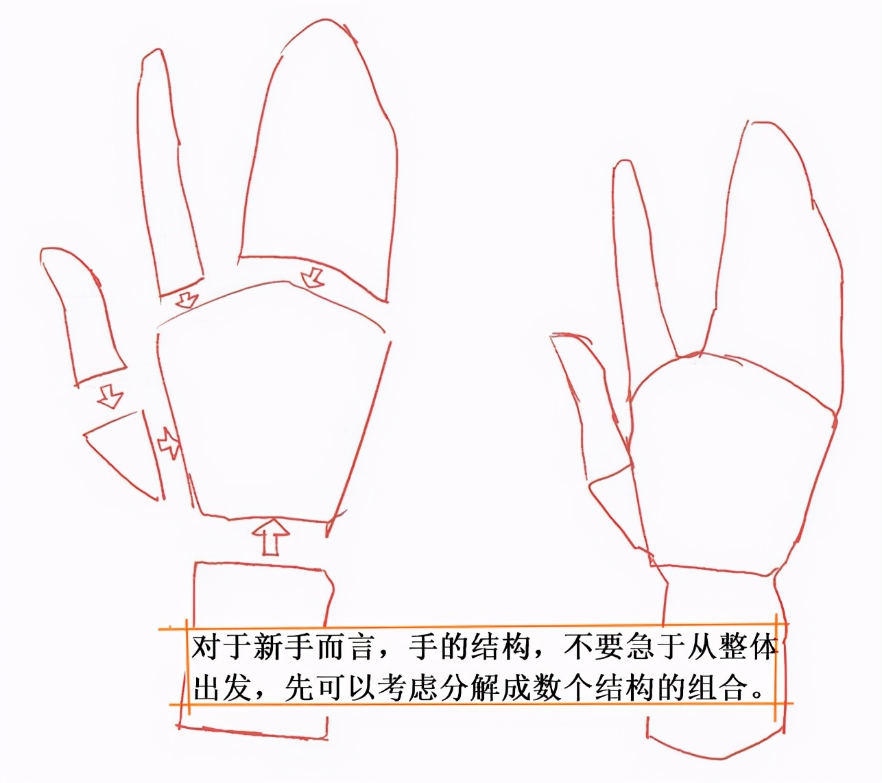 对于新手而言,手的结构,不要急于从整体出发,先可以考虑分解成数个结构的组合。