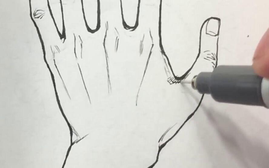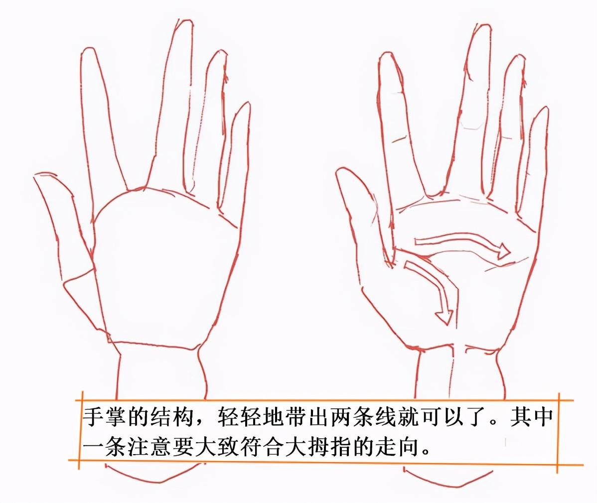 手掌的结构,轻轻地带出两条线就可以了。其中一条注意要大致符合大拇指的走向。