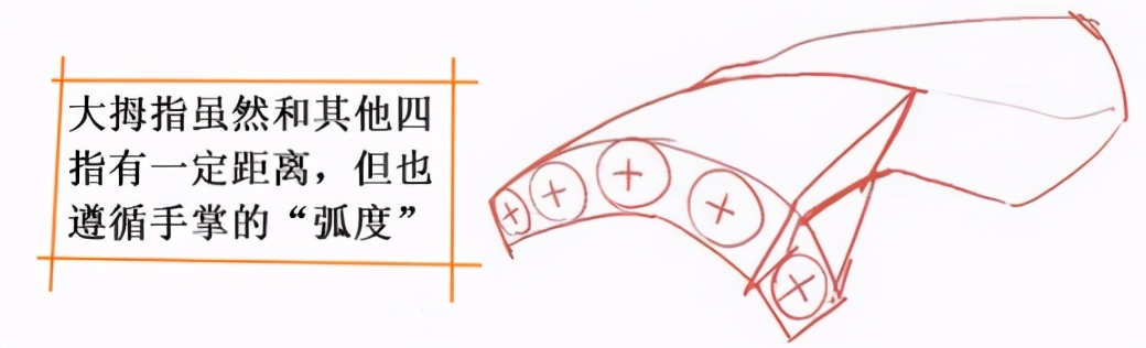 大拇指虽然和其他四指有一定距离,但也遵循手掌的“弧度”
