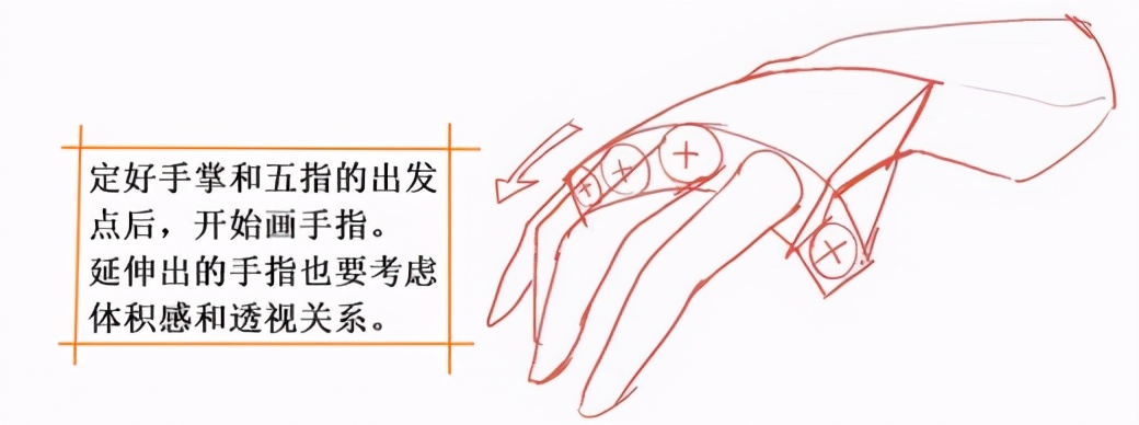 定好手掌和五指的出发点后,开始画手指。延伸出的手指也要考虑体积感和透视关系。