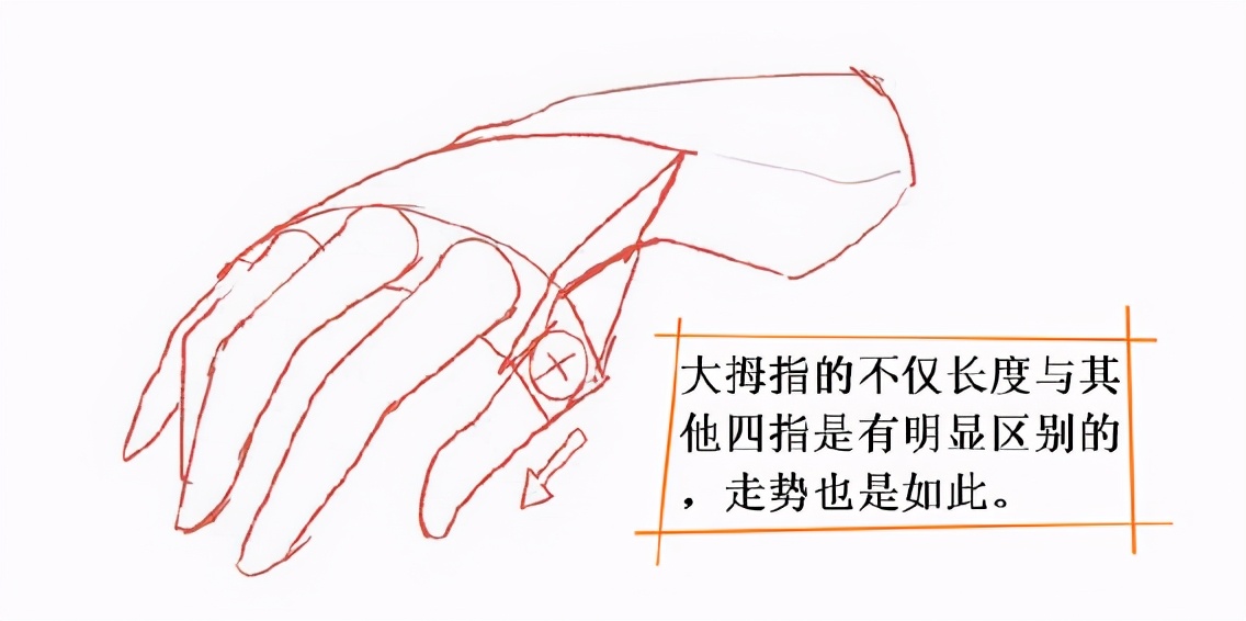 大拇指的不仅长度与其他四指是有明显区别的,走势也是如此。