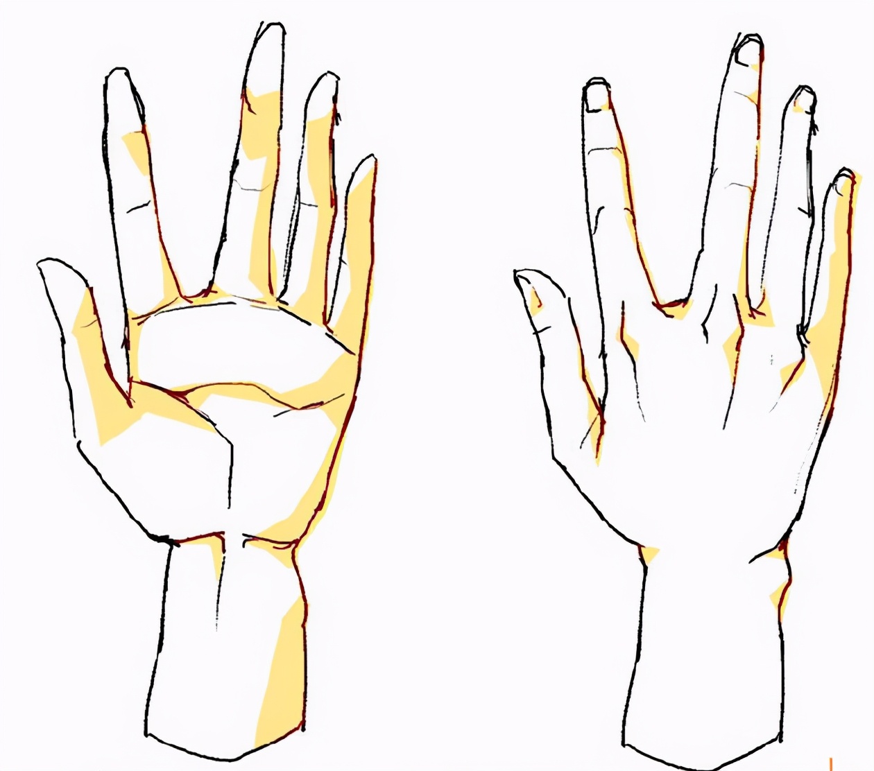即便是同一只手,手心手背也是不一样的。手心要画出“凹下去”的感觉。而手背,则要画出关节和经脉的“凸起”趋势