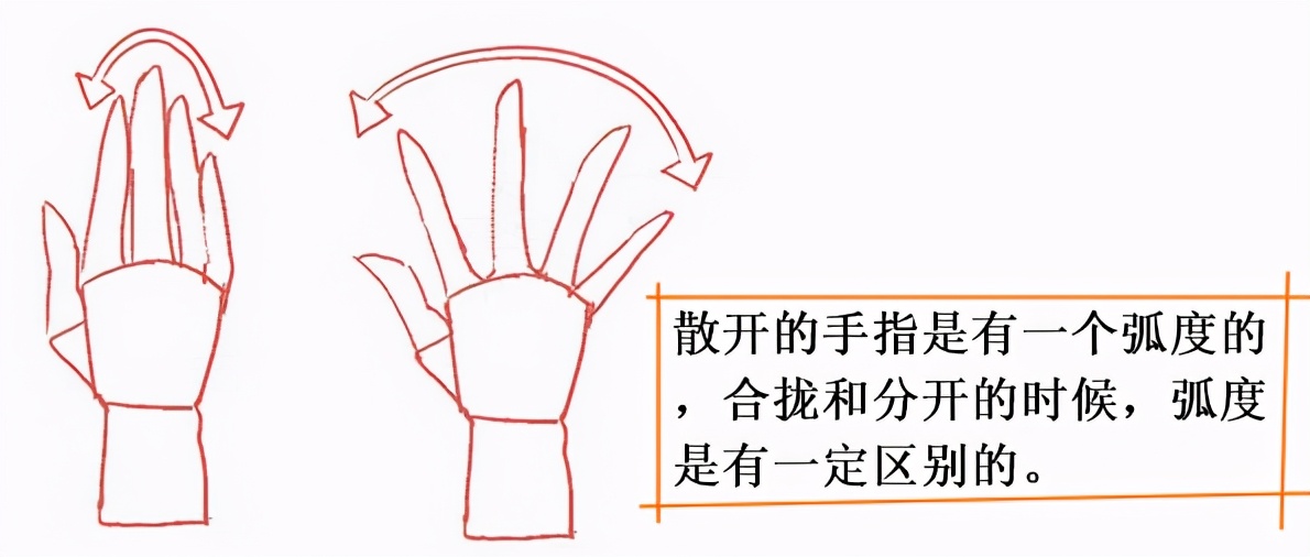 散开的手指是有一个弧度的,合拢和分开的时候,弧度是有一定区别的。