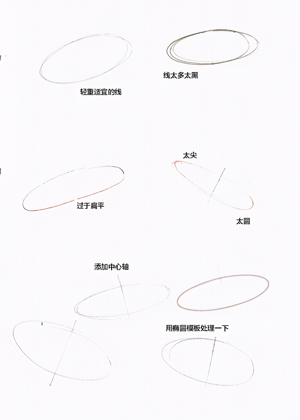 2、然后再画一点浅线条,可以用椭囫模板处理一下,没绕着椭圆的多出来的线条可以用橡皮擦了。但是不要去重复的画线条加重它,这样只能让你本来画的并不标准的椭圆显得更加明显。