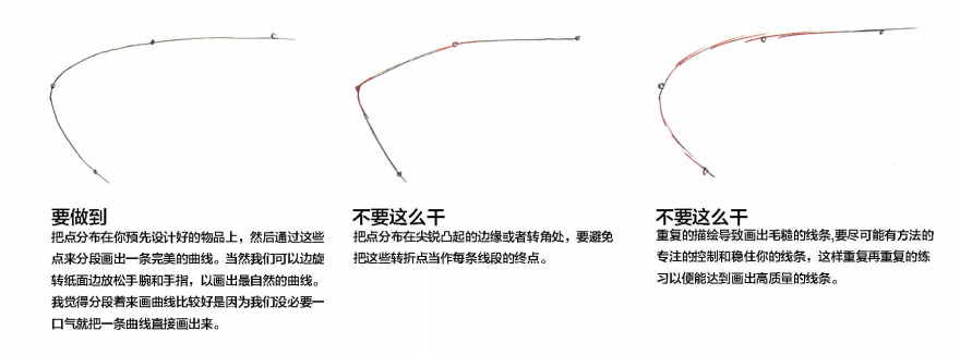 在预先留有的点上,是可以画出流畅并且优美的曲线的。最有效的就是在这些带有转向性的导向点上分段作画而不是把它们当做端点作画。否则,这样就会导致我们要重新画好几次这些线段.就会造成这条线看起来非常的毛糙。如果出现了这样的情况,这就要求你就要多多练习了。