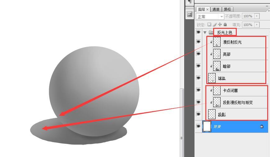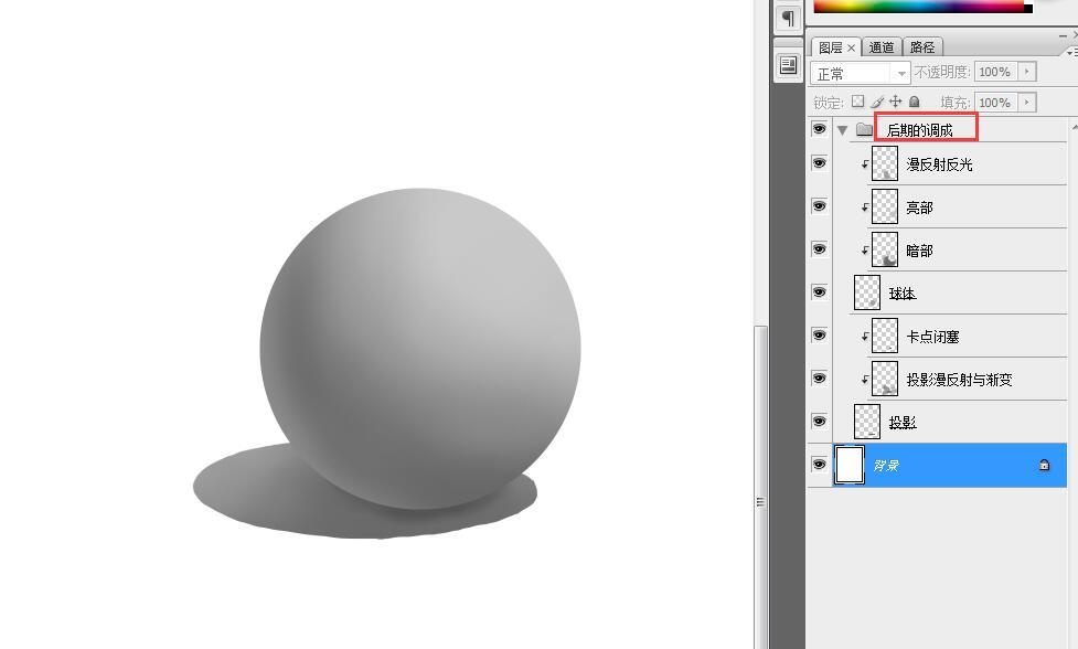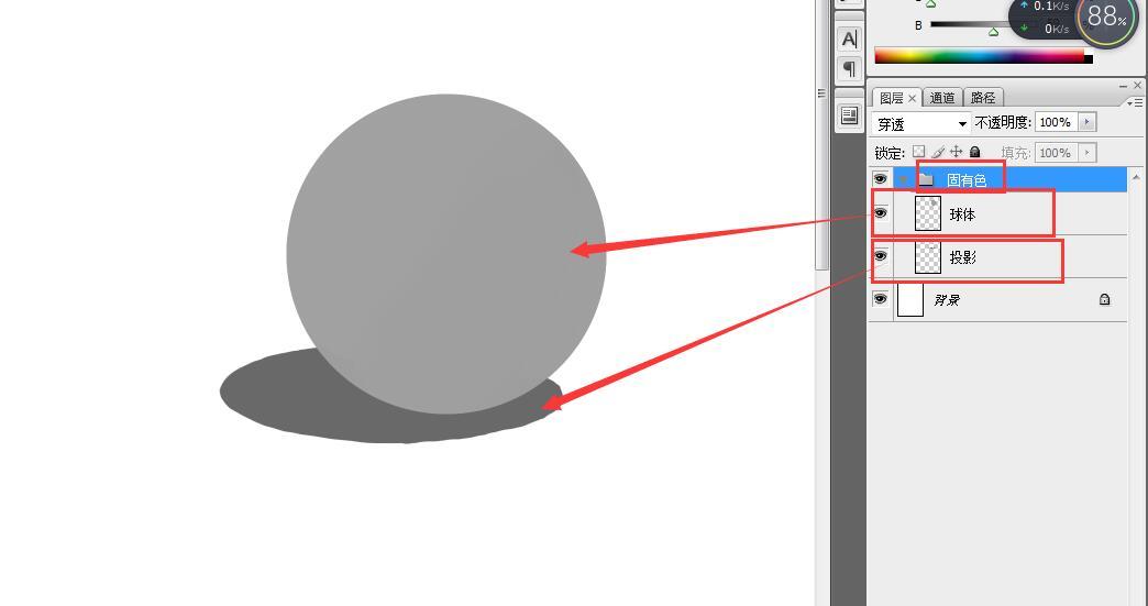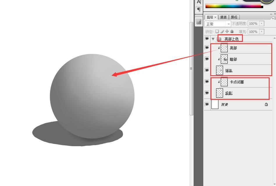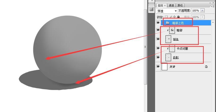第二步:在固有色图层上面新建图层,然后鼠标放在新建和球体的图层之间,按住Alt不放,看到鼠标箭头变样了就按下鼠标的左键。然后在新建的图层上面去暗部的颜色,但你要注意暗部的颜色不能跟固有色的差距过大,因为正常的情况下,暗部的颜色不会夸张的偏离固有色的明度差距的,不然会显得明度过于曝光(就算过度流畅后也会显得脏,一般只有强光的情况下明暗的对比才会差距大),这种情况就是我们常说的固有色不稳定。投影的卡点闭塞,物体与物体的重叠之间是有黑不溜秋的缝隙的,这种我们都叫卡点闭塞,你可以拿物体与物体之间靠在一起观察下就能发现的了。