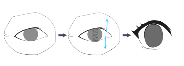 然后,掏出...一根弹簧....把它放在眼皮中间~把整个眼睛撑起来(好像实操性有点低),再夸张一下眼睫毛和瞳孔的大小。