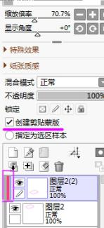 在sai中,需要勾上图层面板上的"创建剪贴蒙版", 创建完图层前面就会出现这样的小粉条。这样颜色就不会涂出界啦!