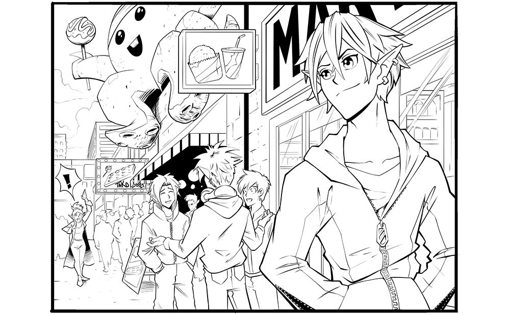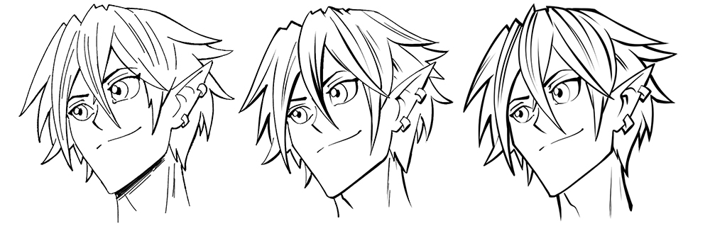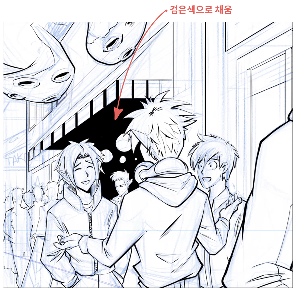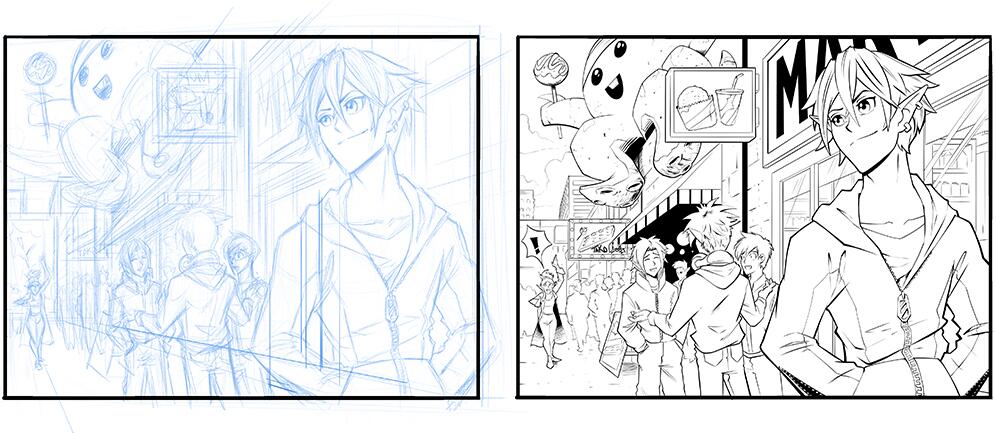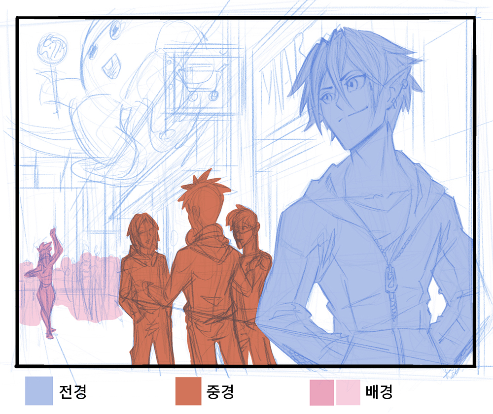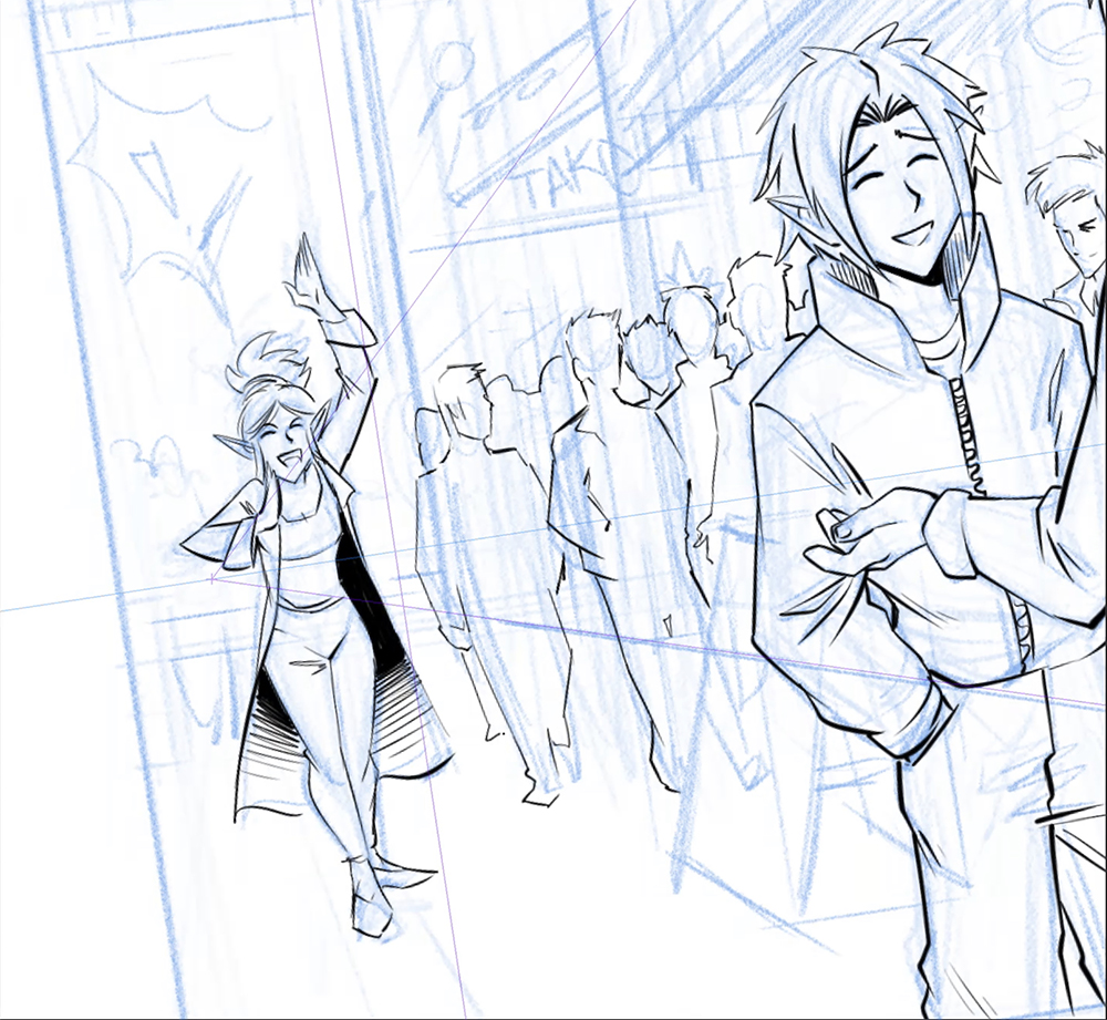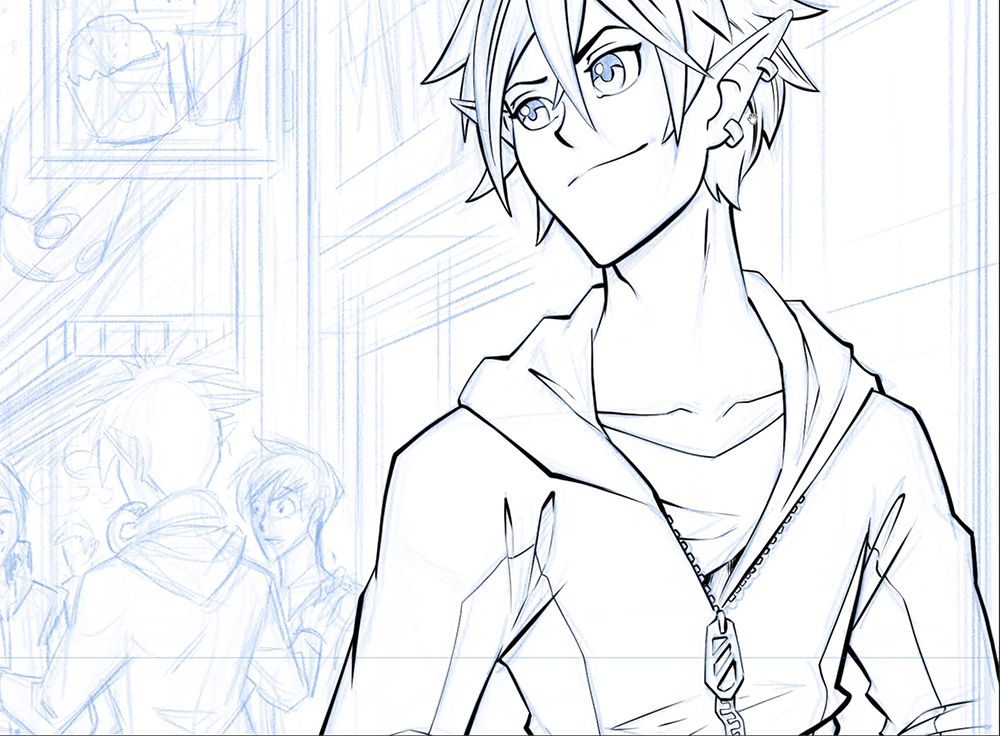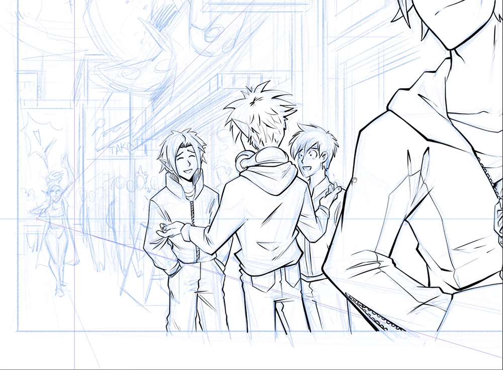对前景人物和事物进行笔触。因为前景最接近读者,所以轮廓应该更粗。无意识地,读者会认为粗轮廓更近,更细的线条更远。