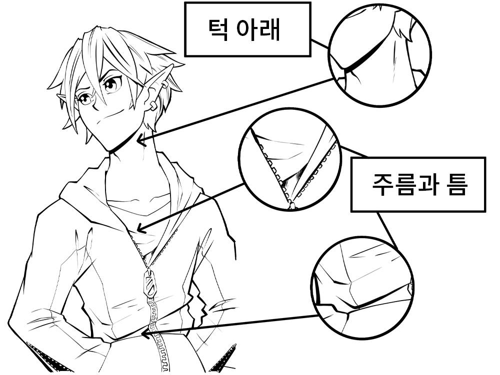 在皱纹、裂缝或下巴以下等小缝隙中粗细线条,给人以深度感,立体呈现作品。这些粗线或填充区域通常位于光线很少或根本没有进入的地方。