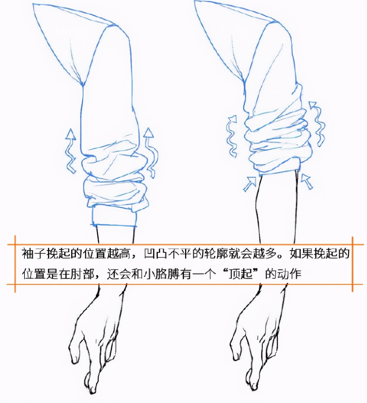 袖子挽起的位置越高,凹凸不平的轮廓就会越多。如果挽起的