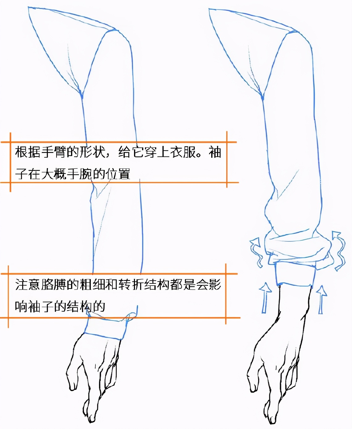 注意胳膊的粗细和转折结构都是会影响袖子的结构的