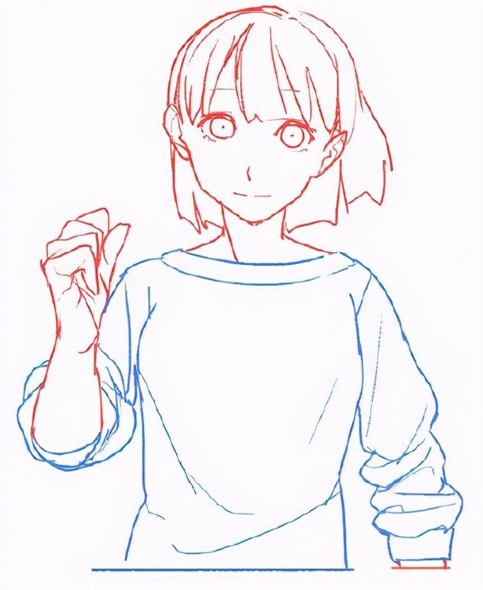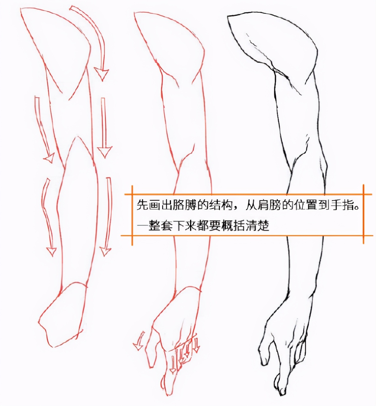 先画出胳膊的结构,从肩膀的位置到手指。一整套下来都要概括清楚