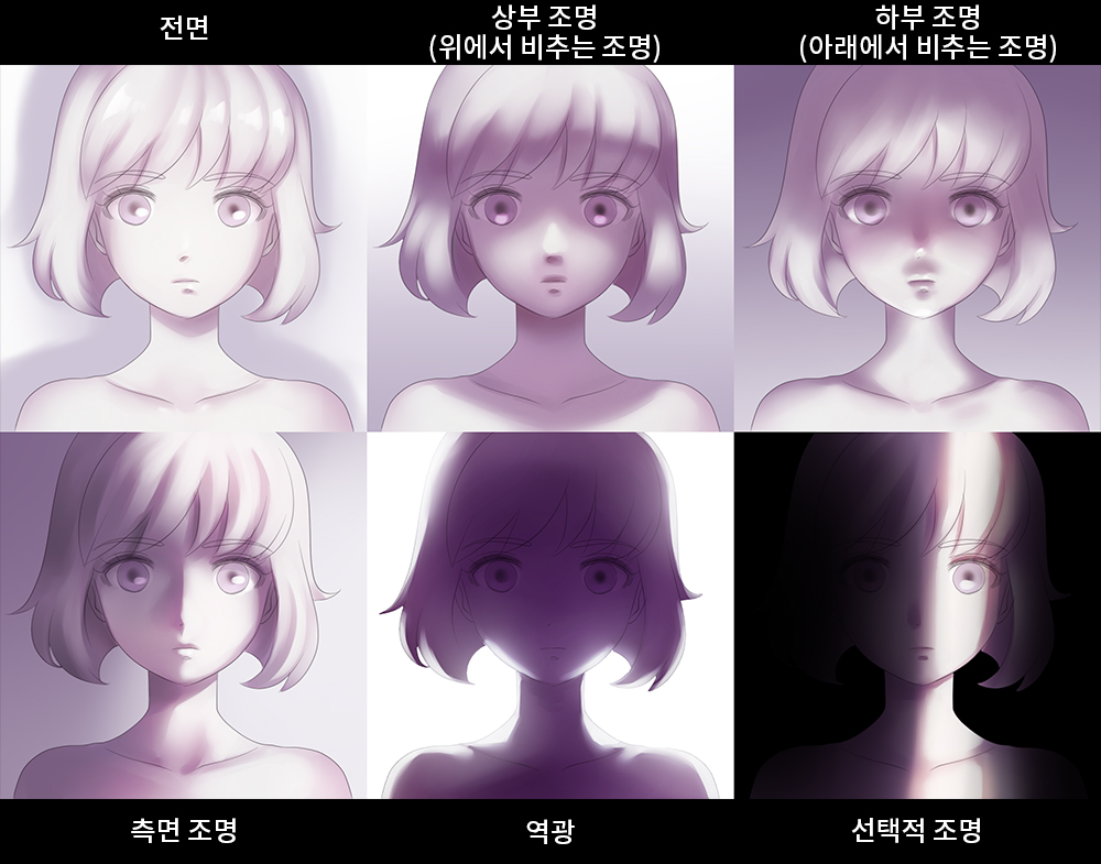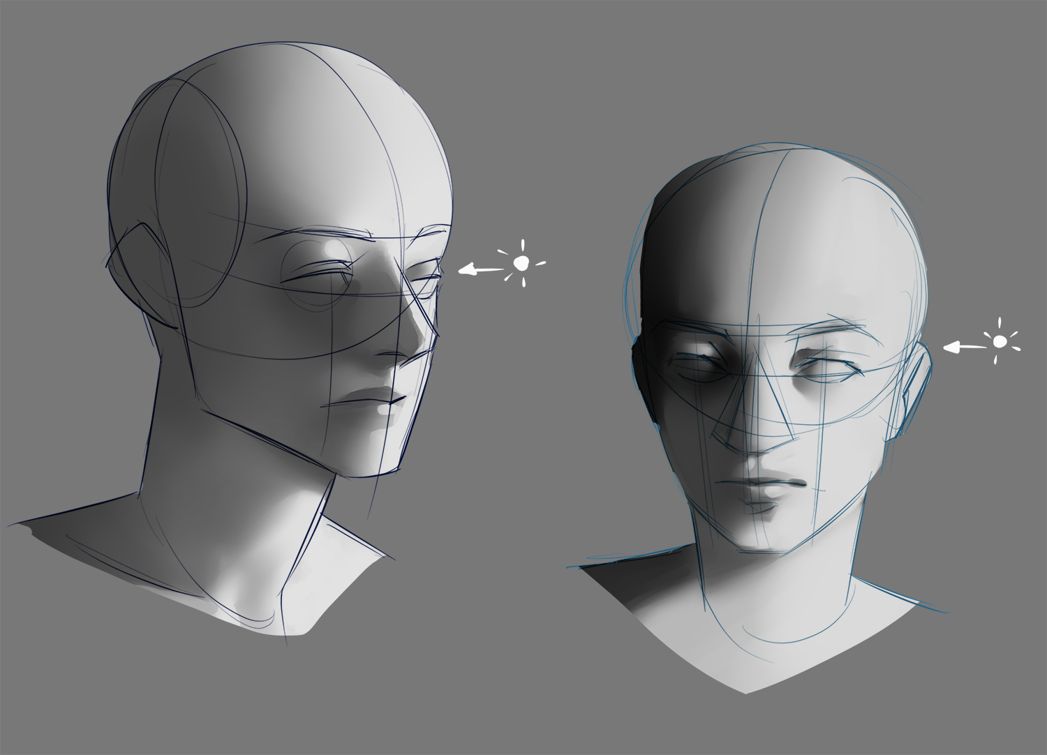 例如,要将阴影应用到人类脸上,可以通过了解解剖和观察结构来识别简单的几何形状(立方体、圆柱、球体...)基于创建面部非常有用。这简化了识别表面受高光、阴影和其他表面反射光线影响的区域。