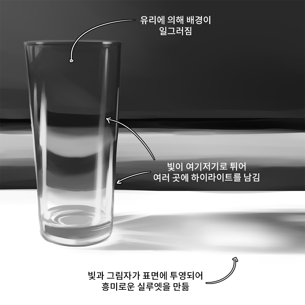 透明的物体可以透射出更多的光。绘制这种类型的物体通常更为复杂。注意细节!在玻璃中,光线会透射,如下所示:
