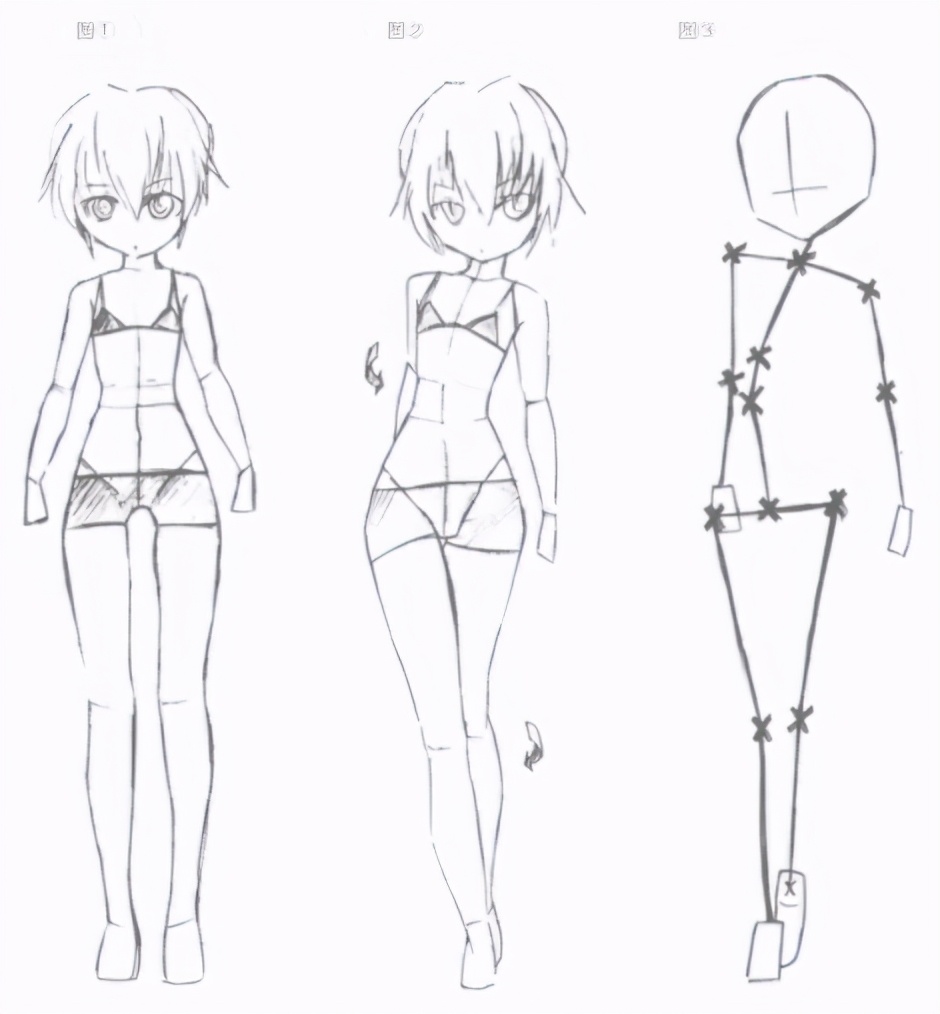 图3是骨架的形状,肩和骨盆的线不再平行,身体的中心勾勒出缓缓地曲线。所谓“婀娜”的动作,是表现具有女孩子风采姿势的基本。