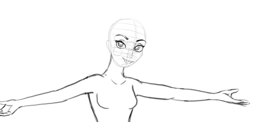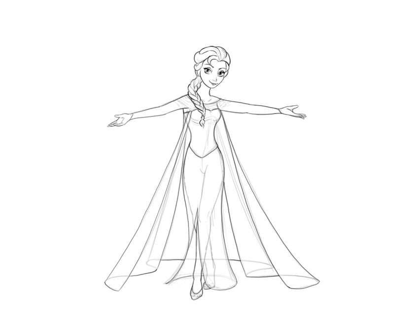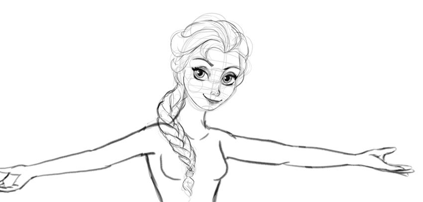 我将使用上一个练习中的姿势,这次将其调整为艾莎身体的特定比例。为了找到正确的比例,我使用了以下过程: