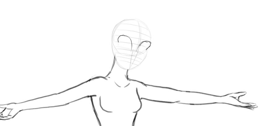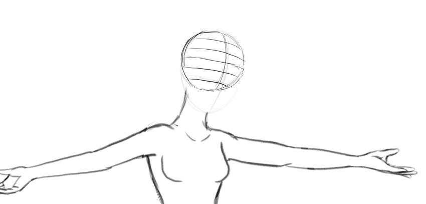 首先是颅骨区域,分为两半,然后分为三部分。这些线有些弯曲,因为头部略微旋转到顶部(这与眼球的规则相同)。