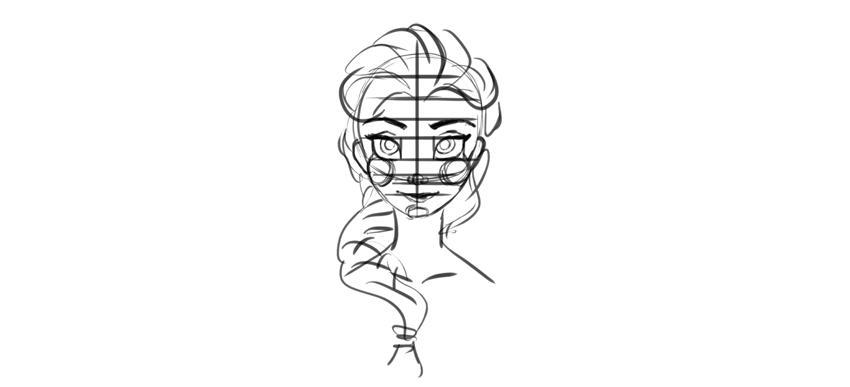 下一步是找到正确比例的脸部。在这里,我复制了一张艾莎的脸部图像(有时可以找到用于此任务的原始角色模型表),并在其上标出比例-眼睛下方,眼睛上方,眉毛,发际线,下巴等的线条。然后,我将其与迪士尼的通用面孔进行了比较,以找出使艾尔莎特别的原因。我发现,其中包括: