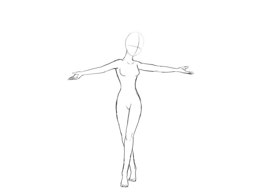 按照参考中的方法绘制了线条-头部顶部,头部底部,颈部底部,胸部底部,腰部,臀部,膝盖,脚踝和脚底。大致找到比例进行绘画。