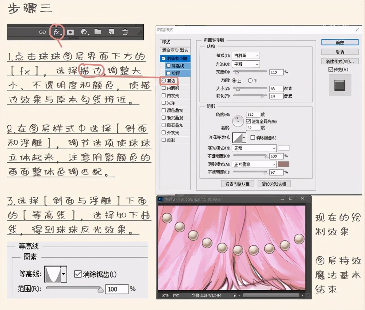 1、点击珍珠图层界面下方的[ fx] ,法择描边调整大小、不语明度和颜色,使搭边效果与原本勾钱接近。
