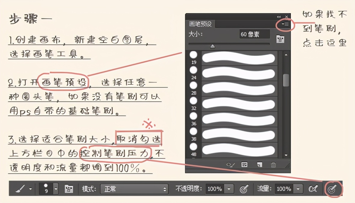 3、选择合适笔刷大小取消勾选上方栏中的控制笔刷压力不语明度和流量都调到100%。