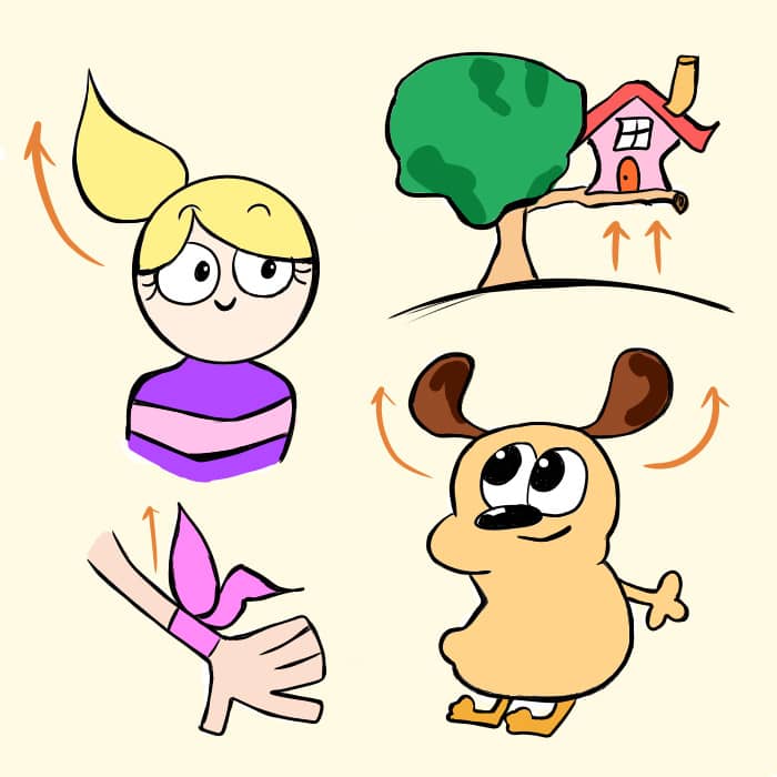 例如,翘起的马尾辫,建在树杈上的房子等。
